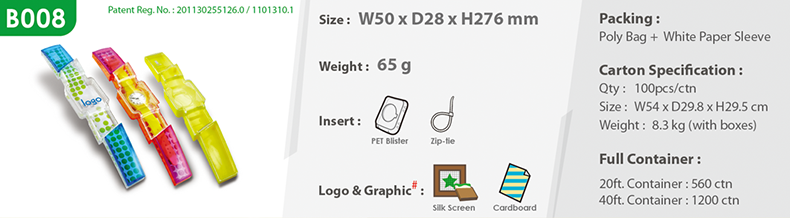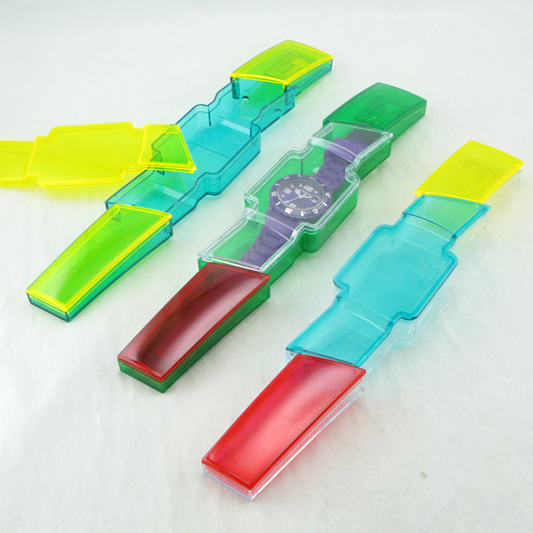 This long watch band display box adopts the novel lightning shape. It's bright, stylish, and helps to display the full length of fancy bands of kids' watches. This lightning-sword like plastic box can actually be an attractive toy as well as a decoration. Especially perfect for kids watch gift packaging.